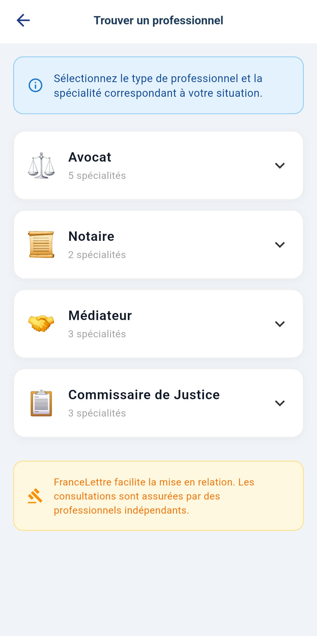 Vous rédigez votre courrier (avec ou sans l'aide de l'IA), vous ajoutez votre signature manuscrite, et vous choisissez le type d'envoi : Lettre Suivie (4,99€) ou Recommandée avec AR (14,99€). Votre courrier est imprimé, mis sous pli et déposé à La Poste par notre partenaire. Vous recevez un suivi directement dans l'app.-+-⚖️ C'est quoi "Trouver un pro du droit" ?