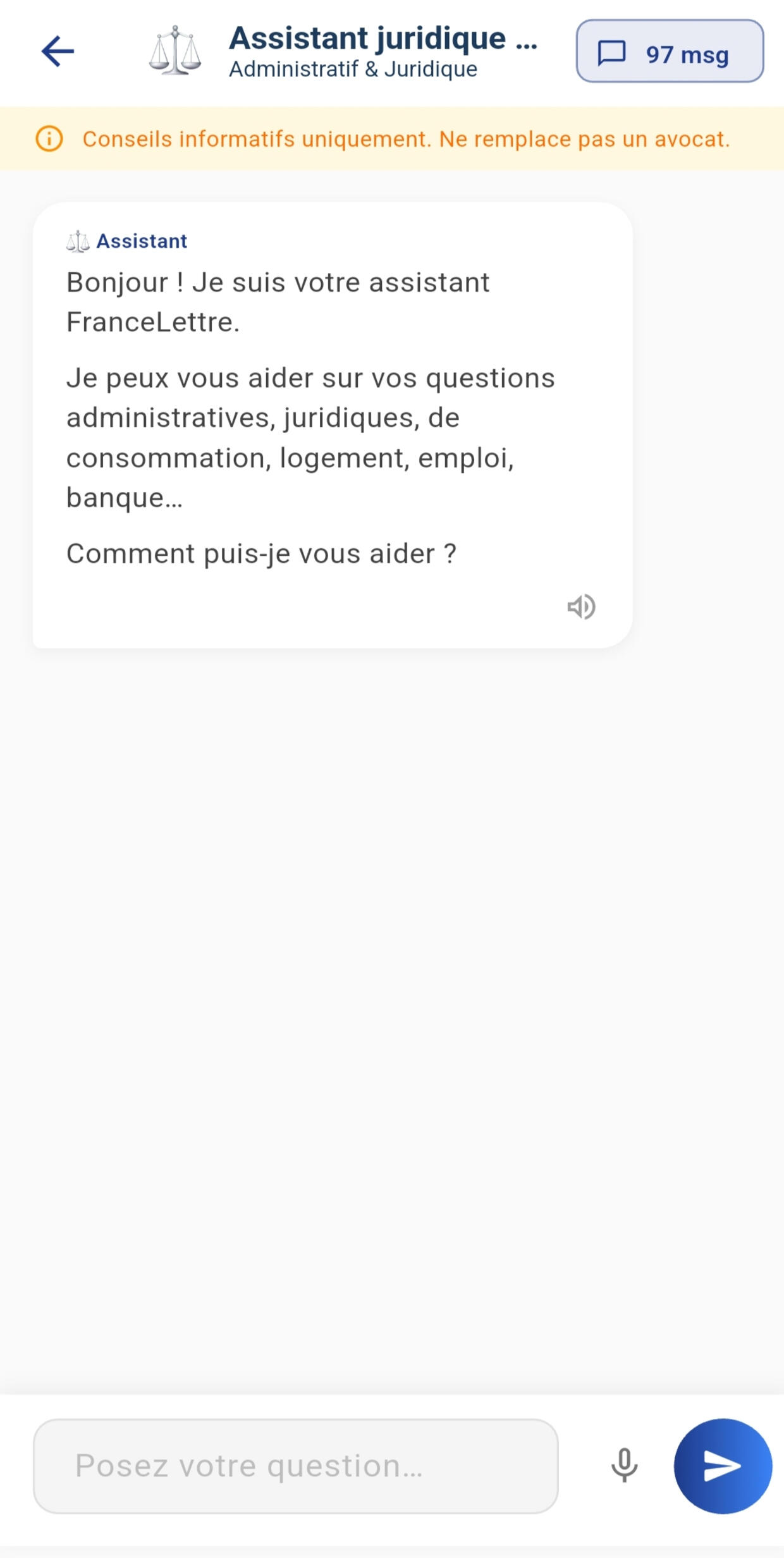 L'assistant juridique IA, propulsé par Mistral AI, vous aide à rédiger vos courriers et répond à vos questions sur le droit, l'administratif, le logement, la consommation, l'emploi, la banque. Il fournit des informations juridiques générales — jamais de conseil personnalisé. Un avertissement légal est intégré à chaque réponse.-+-♿ L'app est-elle accessible ?