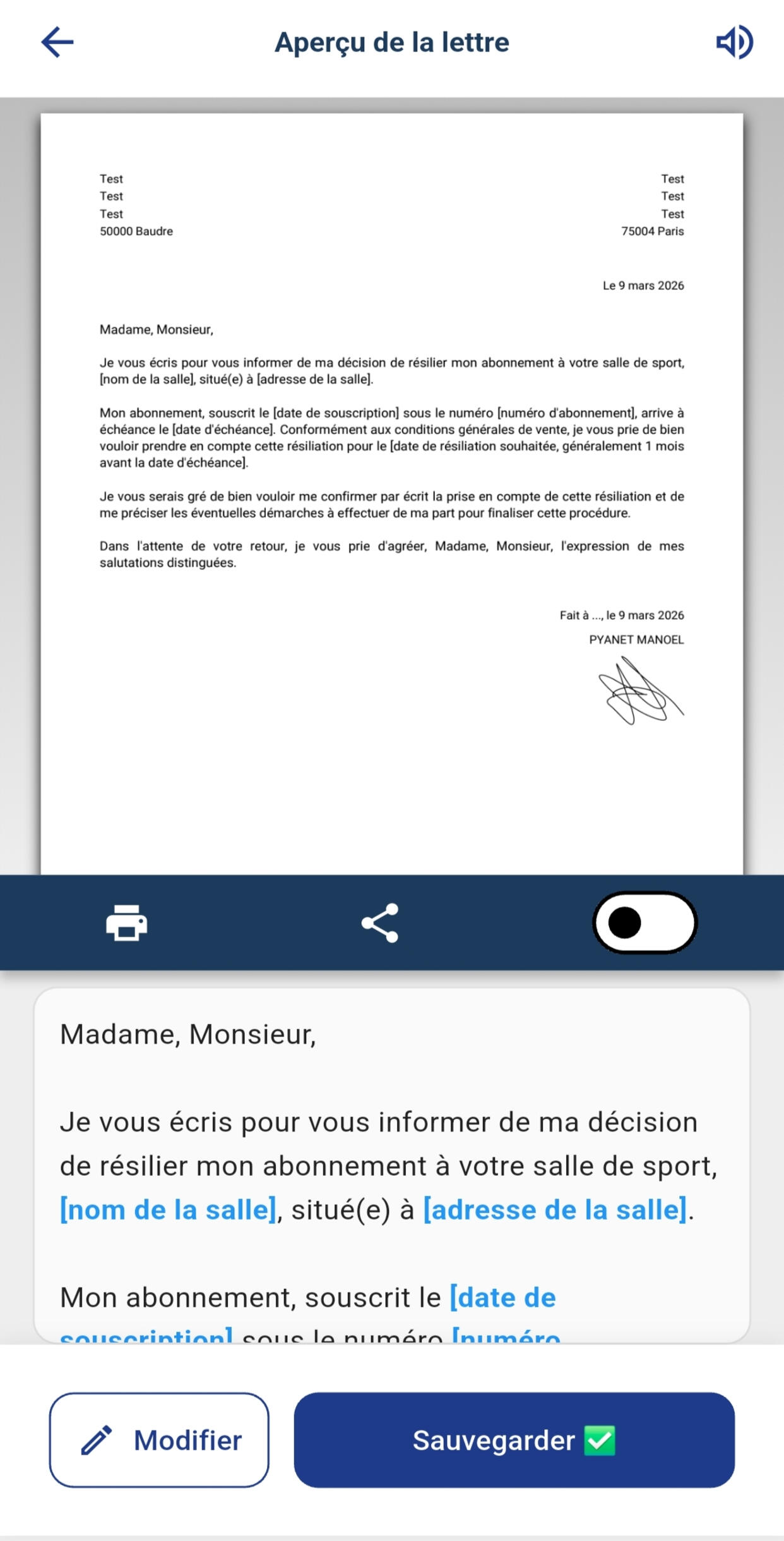 Vous rédigez votre courrier (avec ou sans l'aide de l'IA), vous ajoutez votre signature manuscrite, et vous choisissez le type d'envoi : Lettre Suivie (4,99€) ou Recommandée avec AR (14,99€). Votre courrier est imprimé, mis sous pli et déposé à La Poste par notre partenaire. Vous recevez un suivi directement dans l'app.-+-⚖️ C'est quoi "Trouver un pro du droit" ?