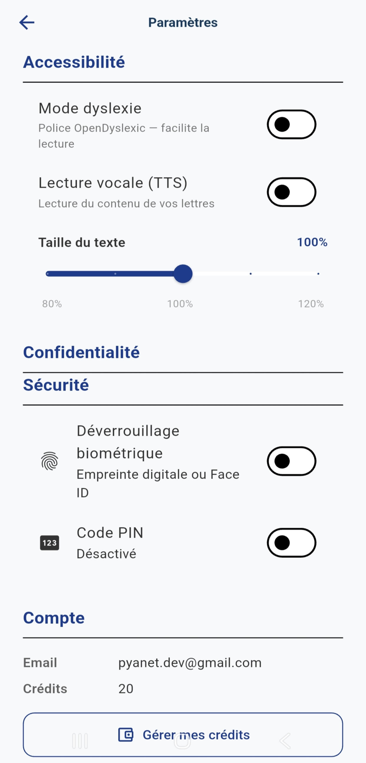 Oui. FranceLettre intègre la police OpenDyslexic conçue pour faciliter la lecture, ainsi qu'une taille de police ajustable de 80% à 120%. L'app est conçue pour être utilisable par tous.-+-🔒 Mes documents sont-ils lus par des humains ?